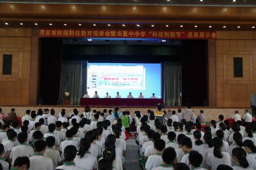 5月27日,茂名市校园科技教育观摩会暨市直中小学“科技创新节”成果展示会在茂名市第一中学附属学校举行,茂名市人民政府副秘书长李恒和、茂名市教育局局长罗欣荣、茂名市科协主席黄少兰等领导出席活动并讲话,与会领导还参观了科技创新成果展示。活动由茂名市教育局、茂名市科学技术协会联合主办,茂名市教育局副局长潘华耀主持。参加活动的有各区、县级市教育局、科协的有关领导和茂名市直属各中小学校校长、科技辅导员以及茂名市一中附属中学学生共计1500多人。